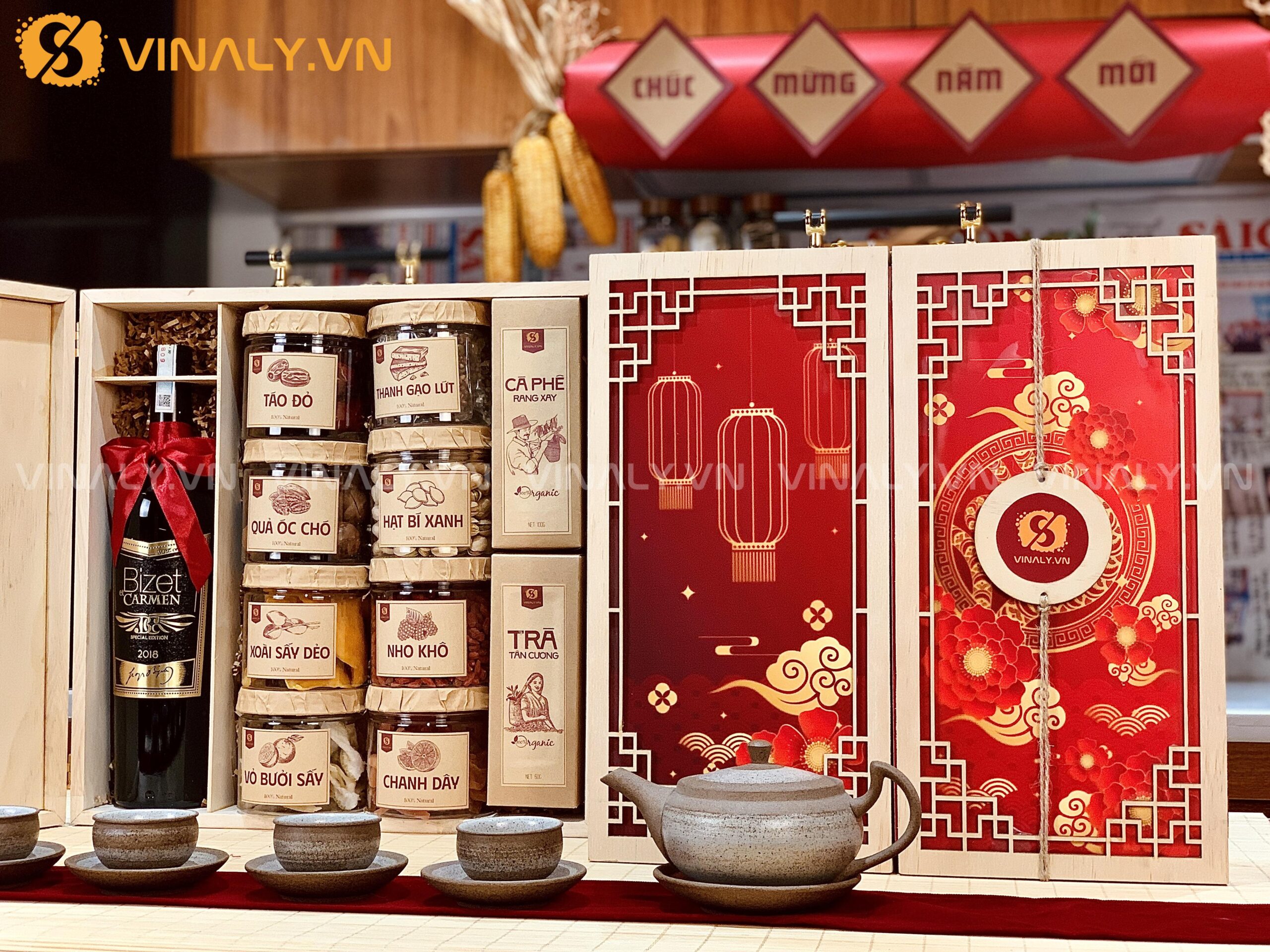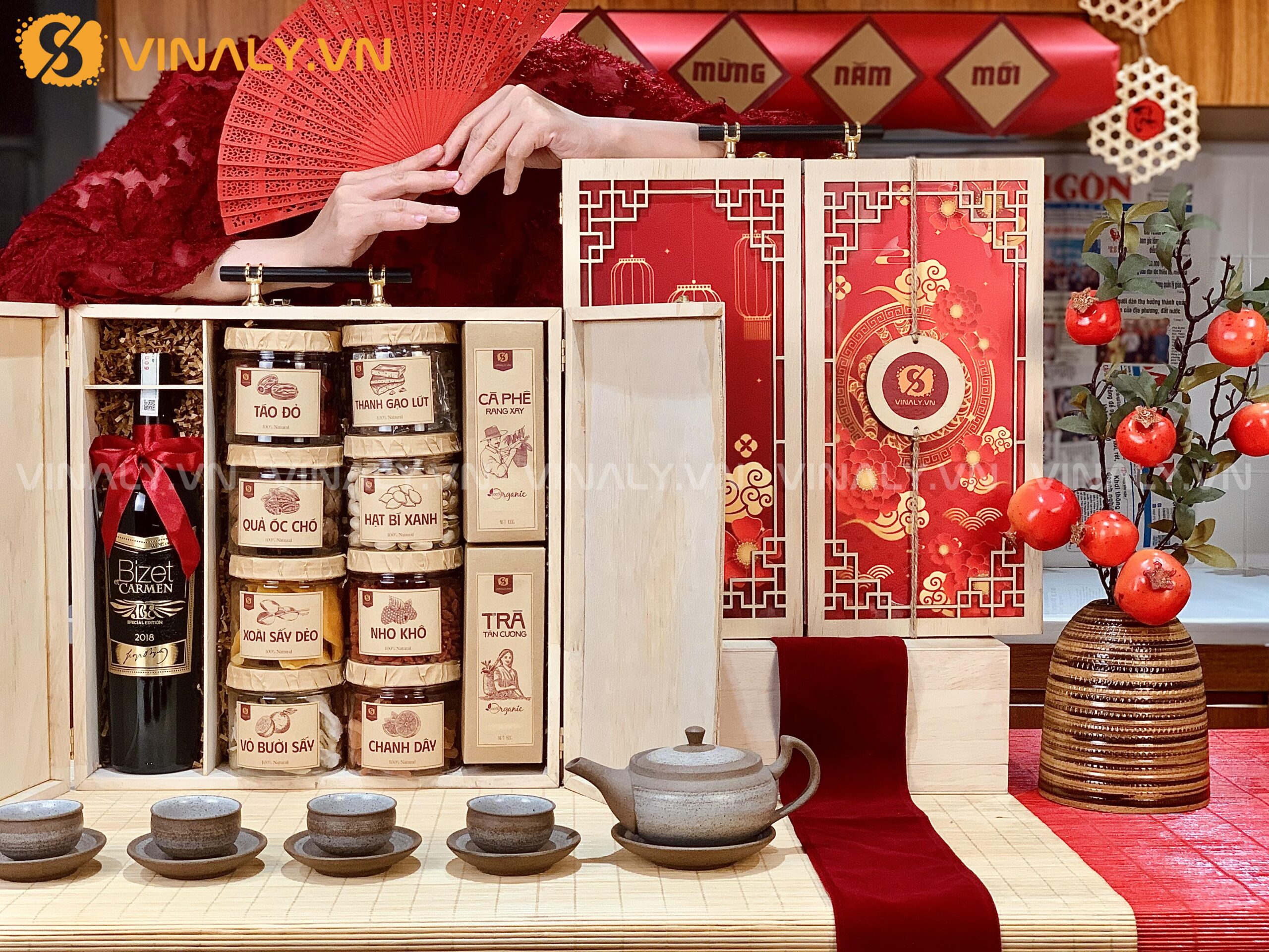 Sử dụng Hộp gỗ CNC nắp gài 33x38x10 có quai xách, trang trí thêm tag giấy, cổ truyền, mộc mạc đúng với tinh thần “Tết Mộc – Quà Việt – Tình bền lâu” và còn thể hiện tinh tế từ đôi tay Việt – Trao gửi yêu thương đến khi làm quà biếu tết khách hàng với lựa chọn bộ quà tết là set quà tết AN KHANG 3 của Vinaly