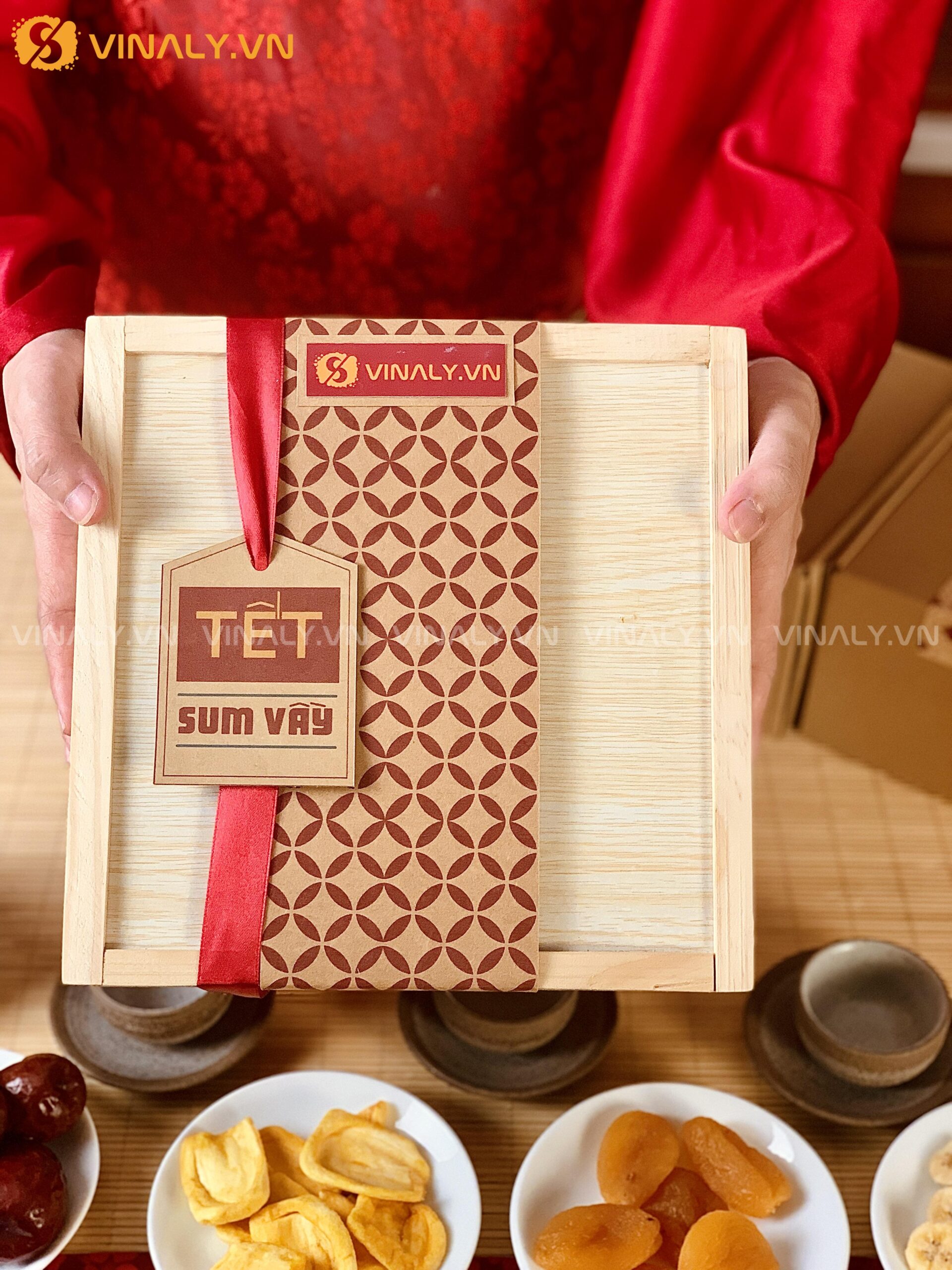 Sử dụng Hộp gỗ nắp trượt 20x20x10 trang trí thêm tag giấy, đi kèm túi giấy, phong cách Tết cổ truyền, mộc mạc đúng với tinh thần “Tết Mộc – Quà Việt – Tình bền lâu” và còn thể hiện tinh tế từ đôi tay Việt – Trao gửi yêu thương đến khi làm quà biếu tết khách hàng với lựa chọn bộ quà tết là bộ quà tết SUM VẦY 2 của Vinaly