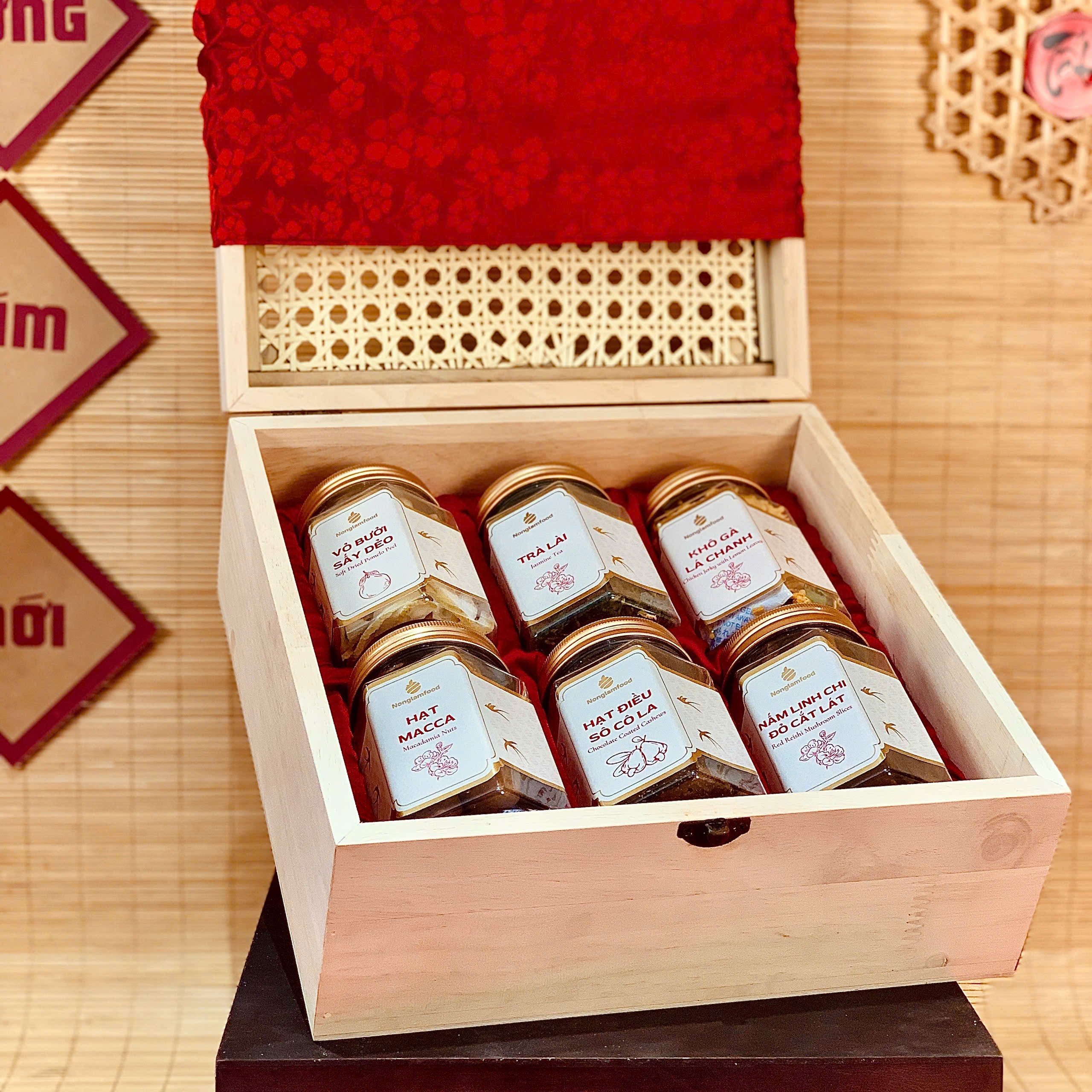 Sử dụng Hộp gỗ nắp mây gài 25x25x11, đi kèm với Túi vải đay, khăn turban gấm, tổng thể tạo nên một set quà Tết đẳng cấp, sang trọng nhưng vẫn giữ được phong cách Tết cổ truyền, mộc mạc đúng với tinh thần “Tết Mộc – Quà Việt – Tình bền lâu” và còn thể hiện tinh tế từ đôi tay Việt – Trao gửi yêu thương đến khi làm quà biếu tết khách hàng với lựa chọn bộ quà tết là set quà tết VINH HOA 1 của Vinaly