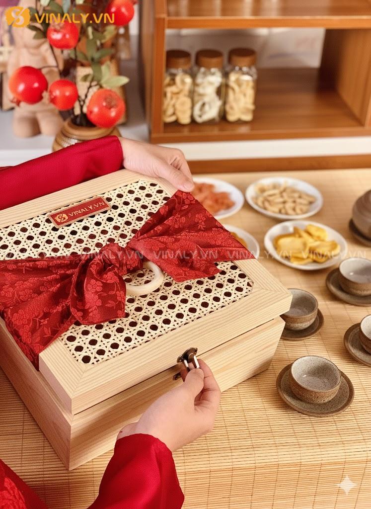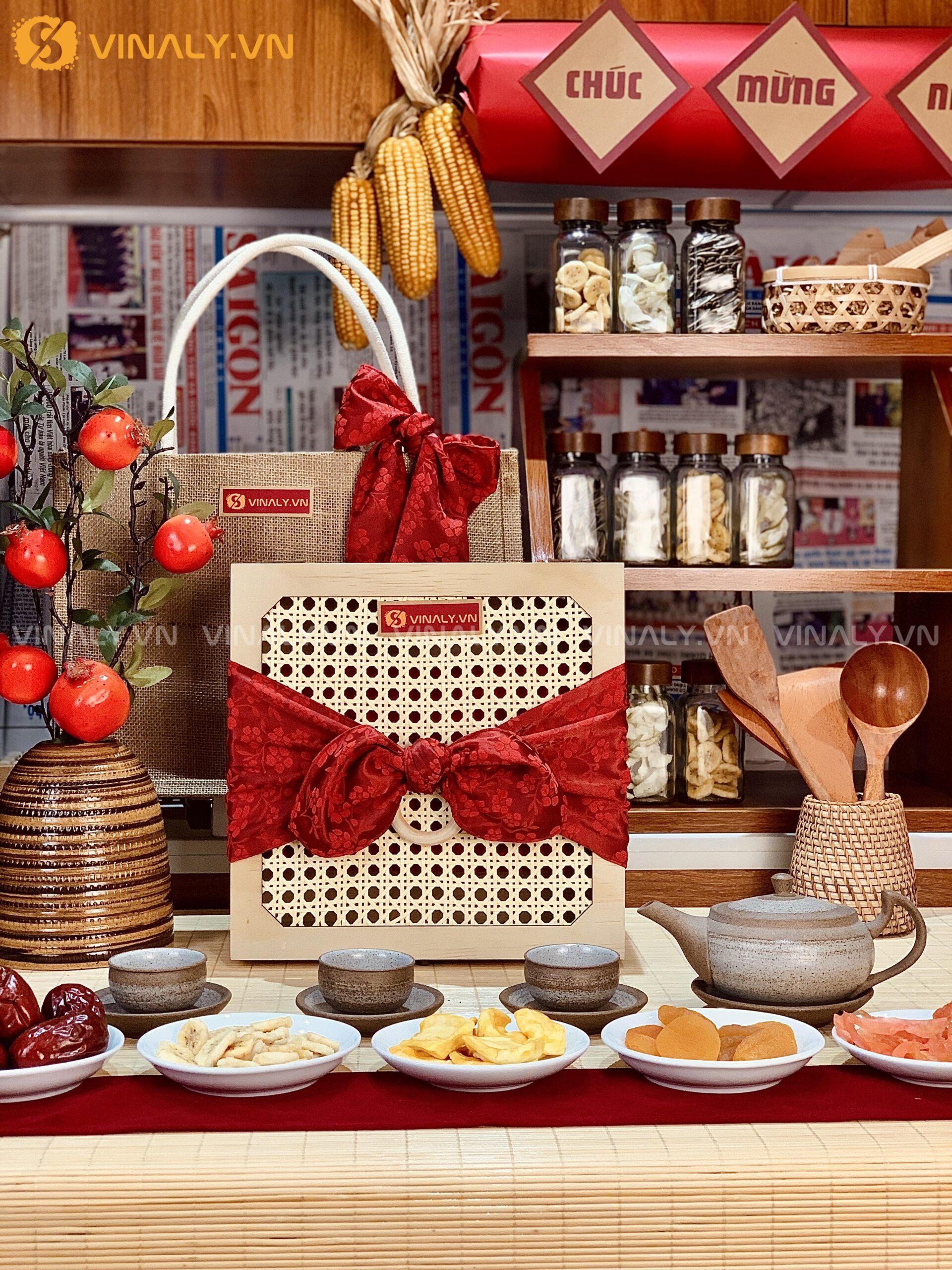 Sử dụng Hộp gỗ nắp mây gài 25x25x11, đi kèm với Túi vải đay, khăn turban gấm, phong cách Tết cổ truyền, mộc mạc đúng với tinh thần “Tết Mộc – Quà Việt – Tình bền lâu” và còn thể hiện tinh tế từ đôi tay Việt – Trao gửi yêu thương đến khi làm quà biếu tết khách hàng với lựa chọn bộ quà tết là set quà tết VINH HOA 1 của Vinaly